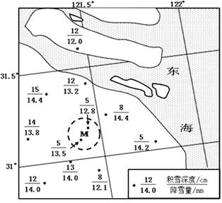 3、单选题  如图为我国某区域冬季某日8时至此日8时的降雪量和积雪深度分布图,该时段该区域风向主要为偏东风,云量分布差异不明显。完成下题。