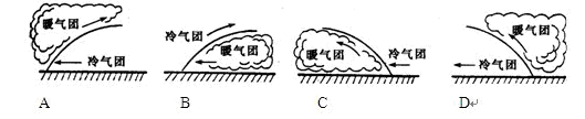 【小题3】甲天气系统为冷锋图示;而锋面两侧的气团分布特征:冷气团密度较大,始终位于锋面之下,而暖气团位于锋面之上,故B、C错误;而冷锋天气图示应为冷气团主动向暖气团进攻,故A图正确。