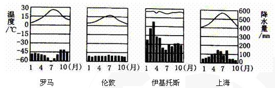 本题解析:本题考查气候类型。根据四地的气温、降水信息,判断罗马为地中海气候(雨热不同期);伦敦为温带海洋性气候(最低月温高于0°C,降水终年均匀);伊基托斯为热带雨林气候(终年高温多雨);上海为亚热带季风气候(最冷月温高于0°C,降水集中于夏季)