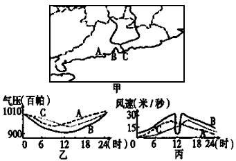 4、综合题  ? 某灾害性天气系统从珠江口附近过境,如图甲所示,A、B、C三地观测到过境时的气压与平均风速随时间的变化规律示意图分别如图乙、图丙所示。分析后回答下列问题。