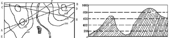 3、单选题 读下面的地形剖面图(下图)是根据等高线地形图(上图)或的某条剖面线画出的,它是: