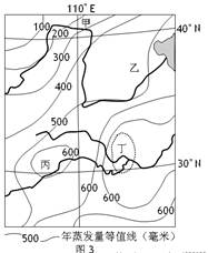5、单选题 图3为我国部分地区地表年蒸发量等值线图。读图回答问题。