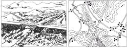 1、单选题 甲图是某校一个研究性学习小组在郊外考察时绘制的一幅景观图,当时小组同学在乙图中的地点及其观察方向是