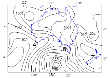 2、单选题 下图为世界某区域海平面等压线分布图,完成下列问题。