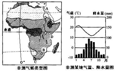 2.气温、降水量图表示的气候类型位于非洲气候类型图中A、B、C、D四处中的?处。
