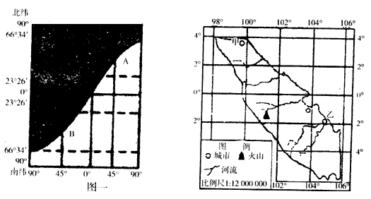 (1)图一中AB曲线为___________(晨线或昏线),此时太阳直射点的位置是________,出现极昼现象