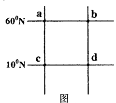 2、单选题 图的ac、bd为两条经线,它们与两条纬线共同组成一个正方形。读图做题: