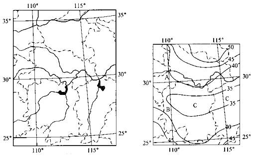 (2)右图中C地带位于长江中、下游地区,7、8月份C地带受副高控制,形成伏旱天气,盛行下沉气流,降水量较少,河流水量较小。所以夏季径流量占全年的35%以下,比重较小。
