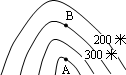 1、单选题 图为等高线地形图,若AB的坡度角测得45°,并量得AB的图上距离为2cm,该图的比例尺为(?)