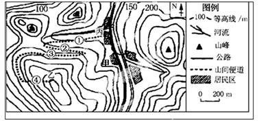 【小题2】甲处和乙地位于不同方向上的山坡上,其间有山脊阻挡,所以在甲处不能看到乙地,A不正确。根据图中比例尺可计算出水平距离约为600米,B答案正确;据等高线“凸高为低”原理,丙处为谷地,可能有河流发育,根据指向标可知,河流流向大致为自西向东,C正确;根据干支流分布,可知图中河流的主干由南向北流。