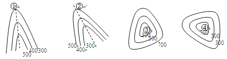 本题考查等高线地形图的判读。等高线的分布可以反映地表形态。闭合等高线中间高四周低为山顶,中间低四周高为盆地;等高线弯曲可以利用口诀“凸高为低,凸低为高”帮助记忆山谷和山脊。凸低为山脊,为分水岭,凸高为山谷,可能发育有河流,河流流向低处;等高线相交处的地形为陡崖;等高线密集反映坡度较大,河流流速较快。①为山脊,②为山谷,③为盆地,④为山顶。所以本题选择D选项。
