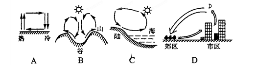 本题解析:冷热不均是形成热力环流的根本原因,受热多的地方气流上升,受热少的地方气流下降,因此A正确;白天,山坡受热快,气流上升,谷地受热慢,气流下降,B正确;白天,陆地升温快,气流上升,海洋升温慢,气流下沉,C错误;城市温室气体排放多,温室效应向,气温高,气流上升,郊区气流下降,D正确。