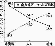 4、单选题 读“我国南、北方水资源、人口及耕地分布对照图(%)”,回答下列小题: