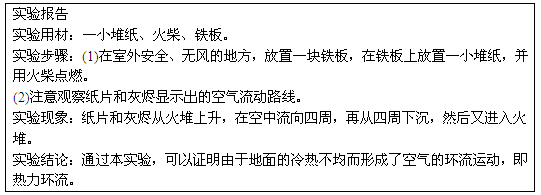 1、综合题  热力环流是大气运动最简单的形式,认识其形成原理是掌握其他大气运动的基础,某教师为使学生更加直观、深刻地理解热力环流的形成,进行了下面的实验。请结合实验报告,完成下列问题。(11分)