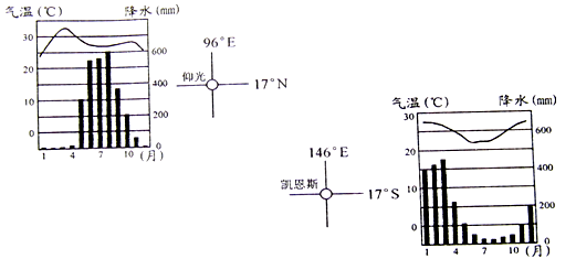 4、单选题  下图是仰光和凯恩斯位置与气候资料图,读图回答以下问题。