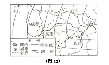 4、综合题 、图l2为我国某区域海平面等压线(单位:百帕)示意图。回答下列问题。(12分)