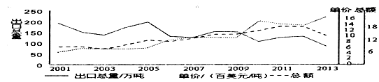 材料三 甲国是世界上最大的鱼粉生产国和出口国,中国是世界同时也是该国最大的鱼粉进口国。下图为2001~2013年甲国鱼粉出口及出口额关系图。