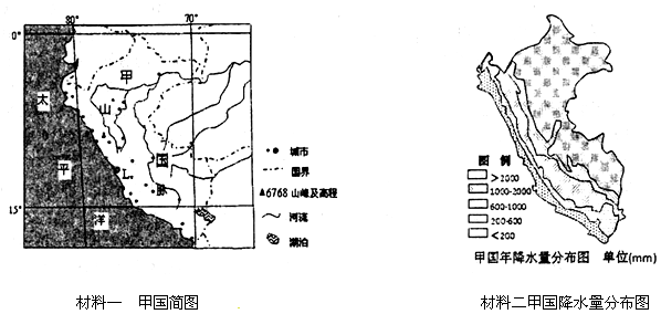 (2)根据材料二,描述甲国年降水量分布特点。(4分)