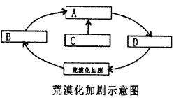 (3)请按因果联系将①人口增长过快、②过垦过牧、③贫困饥荒、④土地生产力下降四项填入“荒漠化加剧示意图”的方框内(只填数码代号),并提出两种抑制荒漠化加剧的可行方法。(4分)