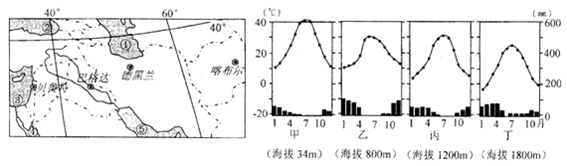 小题2:越往内陆,气温的年较差越大,降水量应越来越少,喀布尔海拔最高,气温较低;甲地夏季气温高,达到40°,应该位于热带沙漠气候区为巴格达。所以本题选择D选项。