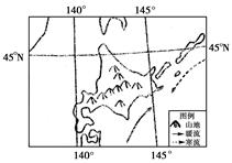 本题解析:该图示意日本北海道附近地区,为温带季风气候区,年降水量东岸多于西岸。受洋流影响,附近有北海道渔场。该地位于太平洋板块和亚欧板块的挤压地带,多火山地震。正确答案选A。