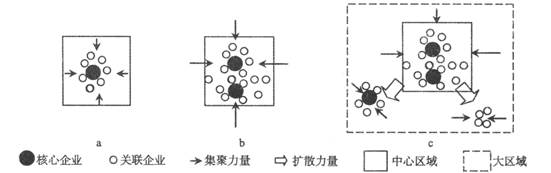 小题2: a—b、b—c都是工业分散的过程。工业分散有利于降低成本,获得最优区位。BC两个答案是工业集聚的效果。