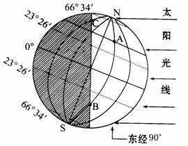 (2)图中所示,A处为______时,C处经度为_________ 。(4分)