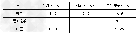 (3)对照表中的数据,韩国、尼加拉瓜、中国分别处于图中__________、__________、_____________(填字母)阶段。由于我国大力开展___________工作,人口增长模式已接近_____________模式。