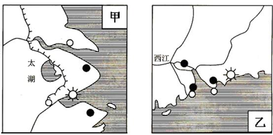 (1)有利条件:两区域都处在河流三角洲地区,地形平坦,农业发达;都处在我国的东部沿海地区,地理位置优越,海陆交通便利;人口稠密,劳动力资源丰富。(3分)