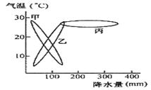 4、单选题 如图是根据甲、乙、丙三地各月平均气温和各月平均降水量所作的区间统计图,读图完成问题。