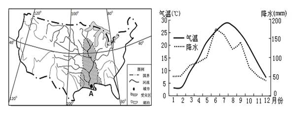 (1)首先要明确阴影区域主要的自然灾害时什么,才能有的放矢。从左图可以看到,阴影位于美国中部密西西比河河谷地带,地势平坦,且一直延伸到墨西哥湾,因为处于大河干流主要流经地区,故自然灾害为洪涝灾害。然后从气候、地形、河流水文水系特征来解释其形成的自然原因。气候:美国中部气候主要为温带大陆性气候和亚热带季风性湿润气候,这两种气候类型的降水都是集中于夏季,且多暴雨,易形成洪涝。地形:美国中部为中央大平原,地势低平,流速减慢,泥沙淤积,河床抬高,导致排水不畅,易成洪灾。河流水文水系特征:结合气候和地形因素对河流的影响,密西西比河流域面积广,支流众多,上游来水量大且汇水快;该河的补给主要为夏季降水,但是冬季有季节性积雪,春季时气温回升,导致积雪融化,易成洪灾。