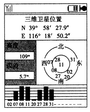 1、综合题  目前,RS、GPS、GIS在国土整治工作中有着广泛的应用。这些现代技术的应用给国土整治工作带来了极大的方便。 GPS(全球定位系统)由空间部分、地面监控系统和用户设备三个相对独立的部分组成。下图是一个GPS信号接收机,根据接收机的显示信息,回答1~3题。