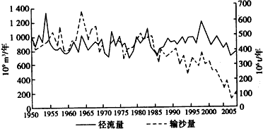 5、单选题 下图示意某河流入海径流量和输沙量的逐年变化。读图,完成1—2题。