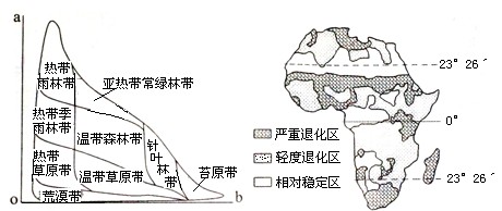 小题2:据上面右图判断,在非洲土地退化的区域中,面积最大的气候类型特征是