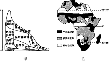 2、据图乙判断,在非洲土地退化的区域中,面积最大的气候类型的特征是