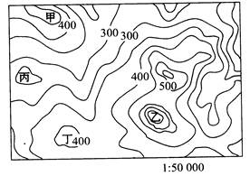 1.如果在图中由甲至乙绘制一幅地形剖面图,其中最低处的海拔高度可能为2.如果乙地在丙地的正西,则丁地在甲地的