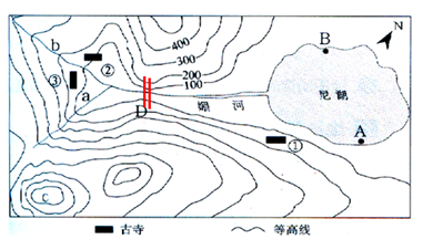 (7)在图中找出最适合建水坝的地址,用“‖”表示,并写出水坝选择建在此处的的原因 。水坝建成后,三座古寺中有可能被水淹的是 。(填数码) (6分)