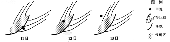 3、单选题 锋线指锋面与地面的交线,图4反映某地区某年4月11日—13日锋线移动情况。读图,回答18—19题。