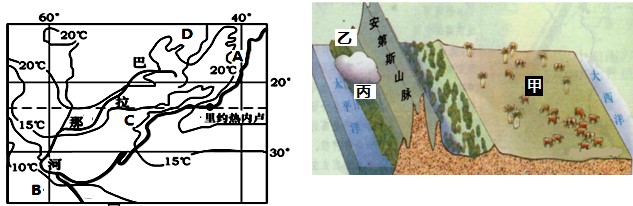 材料:左图为世界某地区某季节等温线图(单位:℃),右图为该地区中纬度自然景观示意图。据材料,完成1~3题。