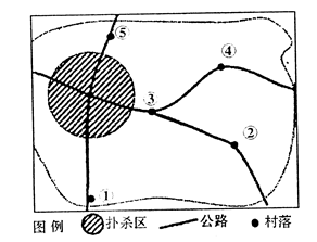 2.依据材料可找出强制免疫的数据范围为3-5km,然后对照第14题计算出的比例尺,找出属于强制免疫的村落。