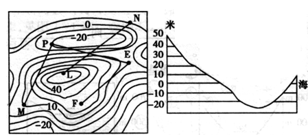 1.根据图示E点周围的等高线分布判断,E位于鞍部,结合E点周边的等高线分布判断,E点的海拔高度位于0—10米之间。