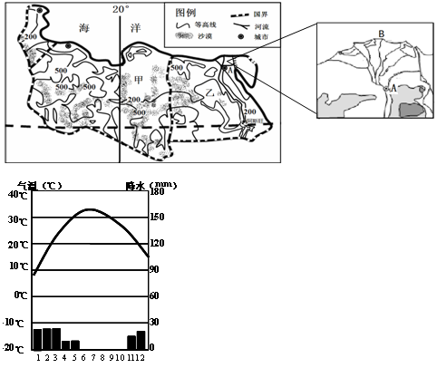 (2)根据图中经纬度结合陆地轮廓可知,甲、乙国两国位于非洲北部,以热带沙漠气候为主,水源缺乏,但是乙国境内有尼罗河流经,所以甲国农业限制性因素:灌溉水源严重不足。该国农业发展过程中的主要环境问题有气温高,蒸发旺盛,不合理灌溉导致的土壤盐碱化;过度开垦导致的土壤荒漠化等。