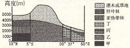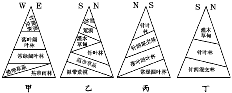 3、单选题 下图为四地山地植被垂直分布示意图,甲地位于南半球,其余均位于我国。读图,回答1—2题。