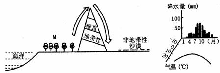 5、单选题 下列左图为世界某区域示意图,右图为M地区气候资料图,图中山地M一侧的山坡为西侧。据此回答下列各题。