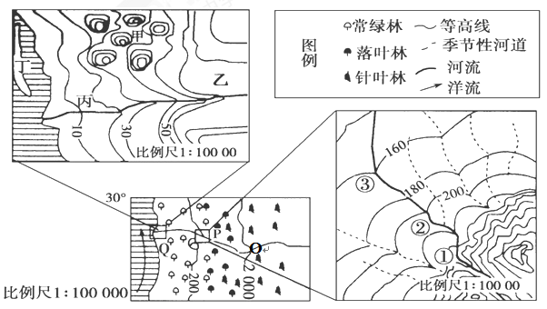 5、单选题  下图为某地区自然景观分布示意图,以及P、Q两区域的等高线图,读图回答下列各题。
