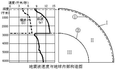 1.根据地震波在不连续面的变化特点,纵波、横波速度突然增加的不连续面①为莫霍面;纵波速度下降、横波消失的不连续面②古登堡面,选A。以莫霍界面和古登堡界面为界,I为地壳(全球厚度17km)II为地幔(上地幔上部存在软流层)III为地核(内核为熔融状态),排除B、C、D。