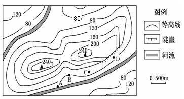 【小题2】读图,可以看到两座小山峰,海拔低于500米,属于丘陵,所以主要是由两座山峰组成的丘陵地形,A对。从图中等高线数值看,河流基本上沿等高线流动,落差小,水流平缓,B错。图中的等高距是40米,根据高差公式(n-1)·d