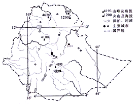【小题2】根据图中经纬度分析,该国位于非洲东部的埃塞俄比亚,纬度低,气温高,城市分布在埃塞俄比亚高原,气候凉爽,A错,C正确。