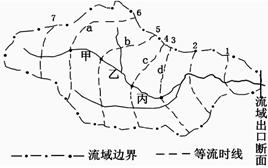 4、单选题 等流时线是指流域内径流能同时到达流域出口的所有地点的连线。按一定的流速,在流域地图上可做出许多条汇流时间的等值线,使得在同条等值线上的水质点能在该汇流时间同时集中到流域出口,这就是等流时线图(如图)。读图(图中数值为相对值)回答问题。