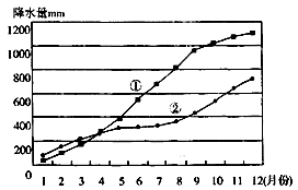 5、单选题 下图是“同一半球亚热带大陆东、西两岸沿海某地年降水量逐月累计曲线图”。